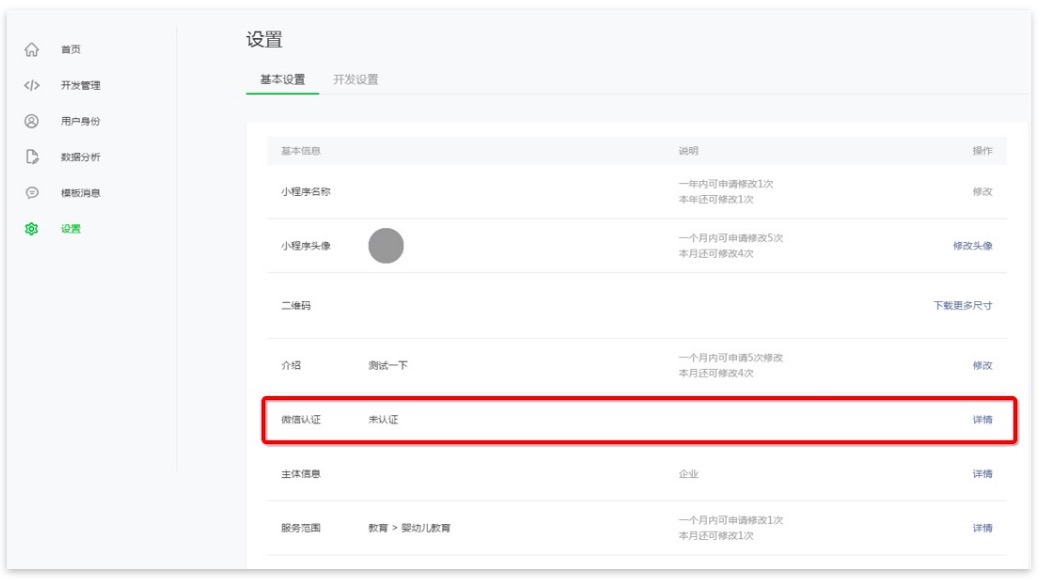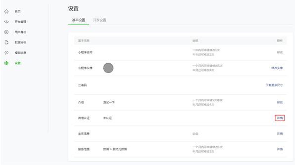 3、进入[设置]-基本信息-微信认证,点击[详情]进入
