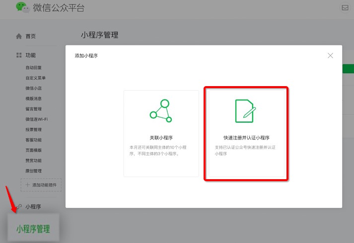 2、进入[小程序管理]-[快速注册入口],快速注册即可,点击查看详细教程