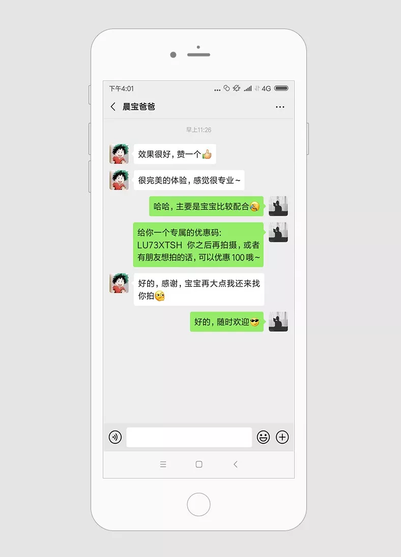 “亲,送你一个专属的优惠码:LU73XTSH,你之后再拍摄,或者有朋友想拍的话,可以优惠200哦~”