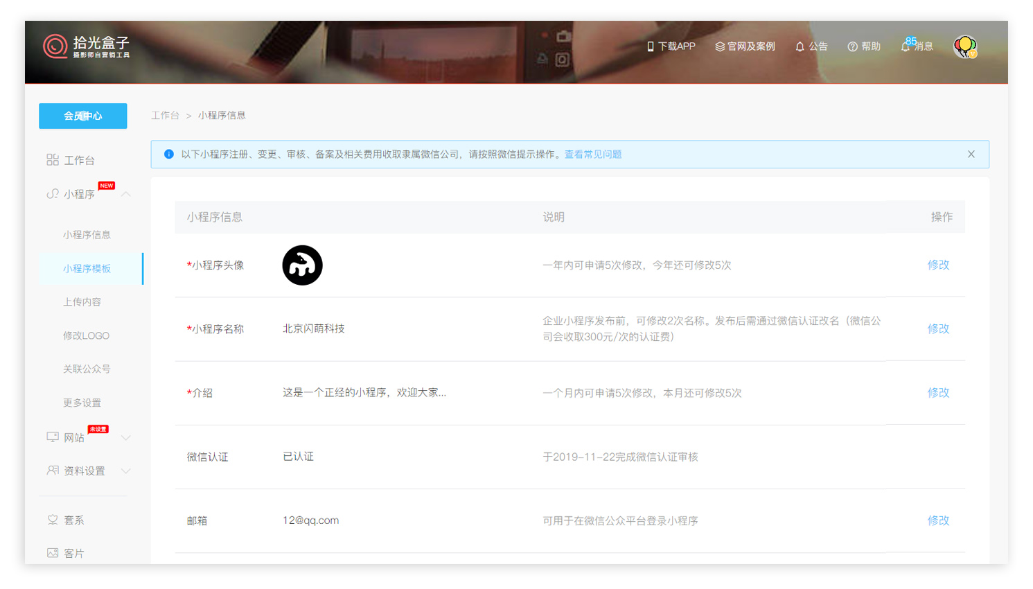 后续的小程序信息修改,比如头像、简介,也不必再登录微信公众平台。在电脑端-小程序-小程序信息里,即可修改(小程序名称仍需前往微信公众平台修改)。