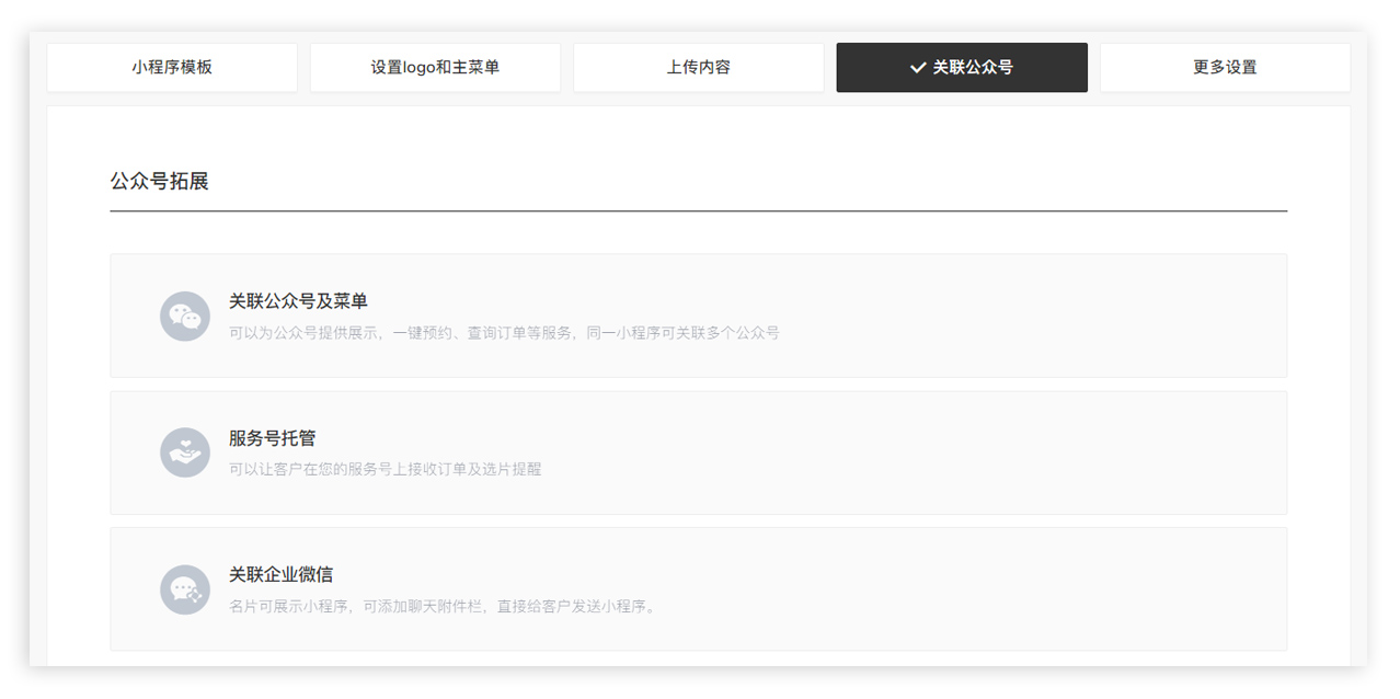 同时可以添加「关联公众号」、「服务号托管」、「关联企业」等菜单。
