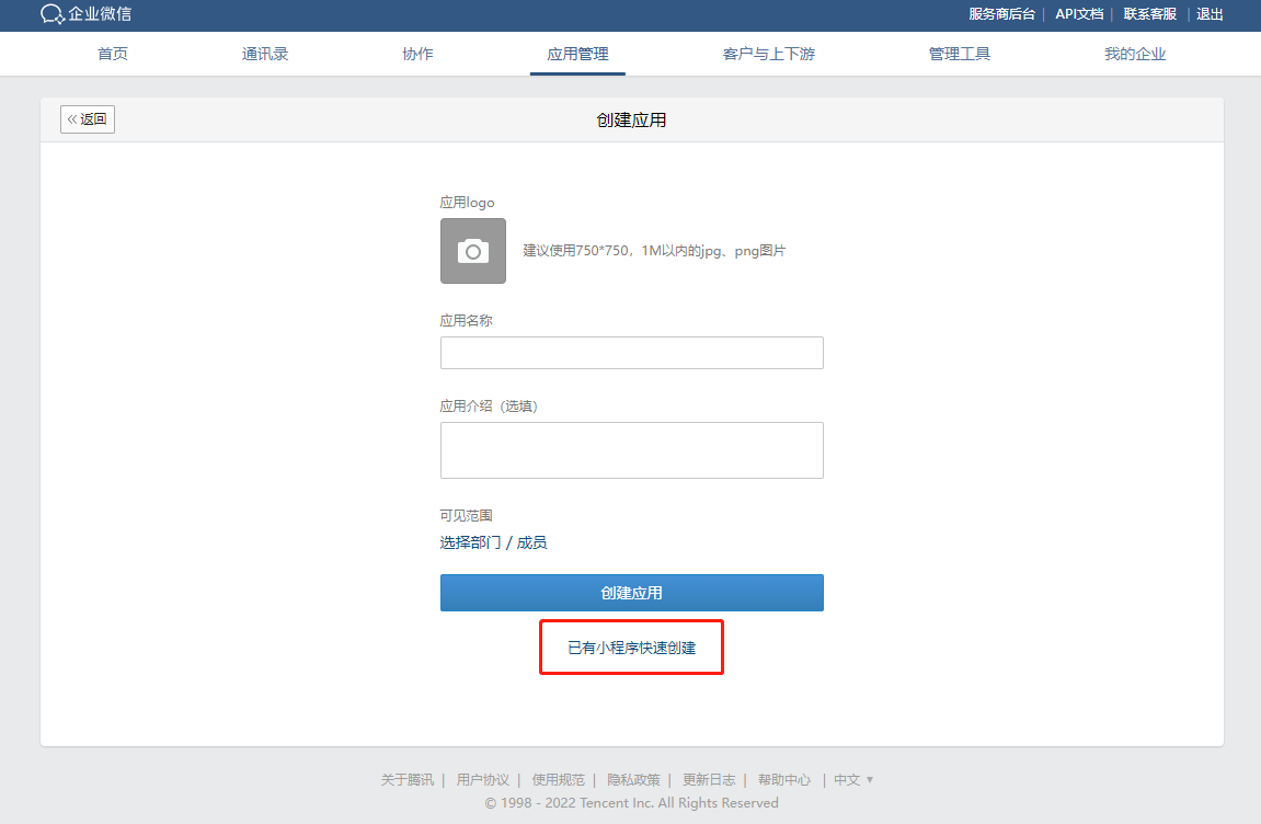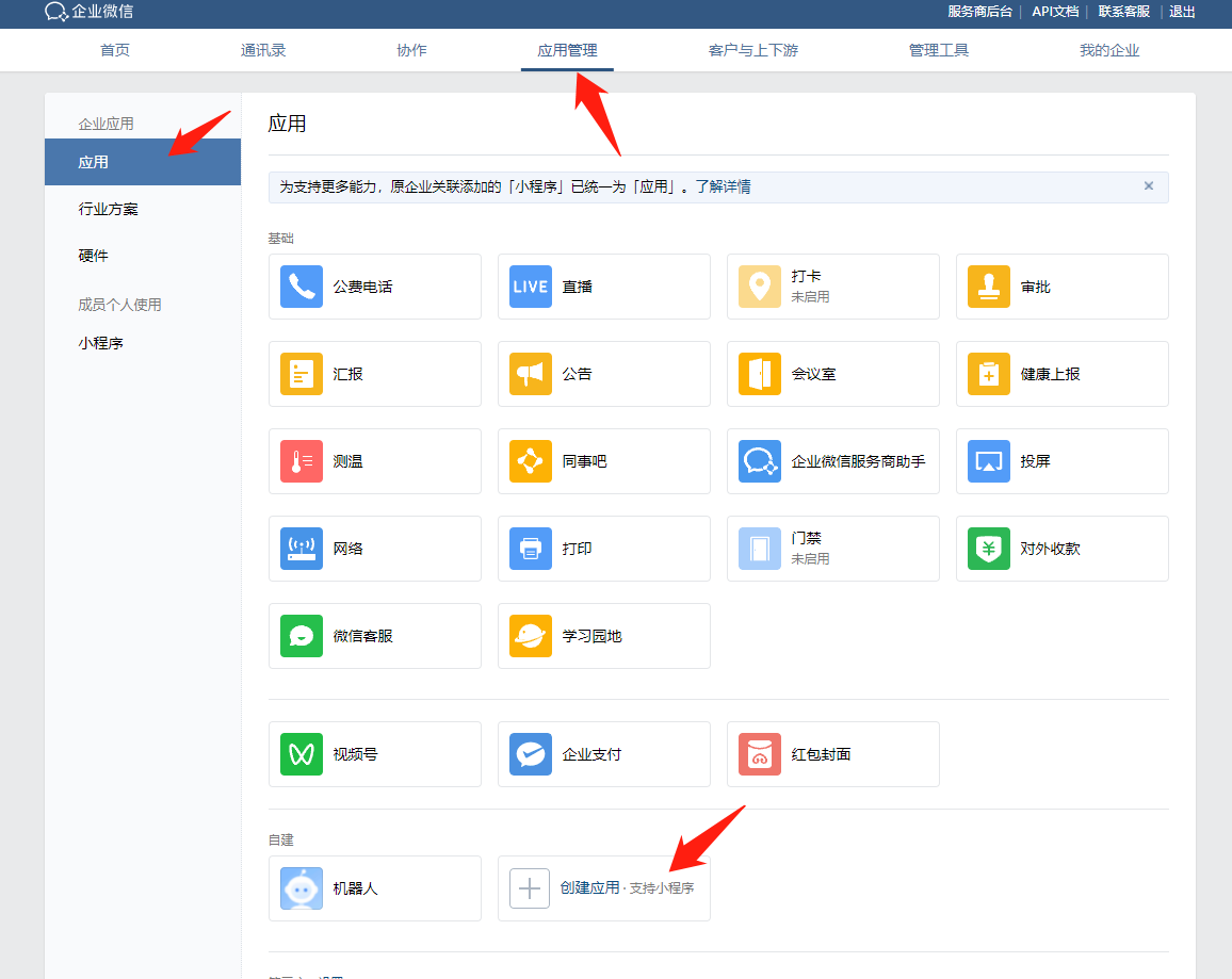 1,企业微信管理后台-进入应用管理-应用-创建应用;