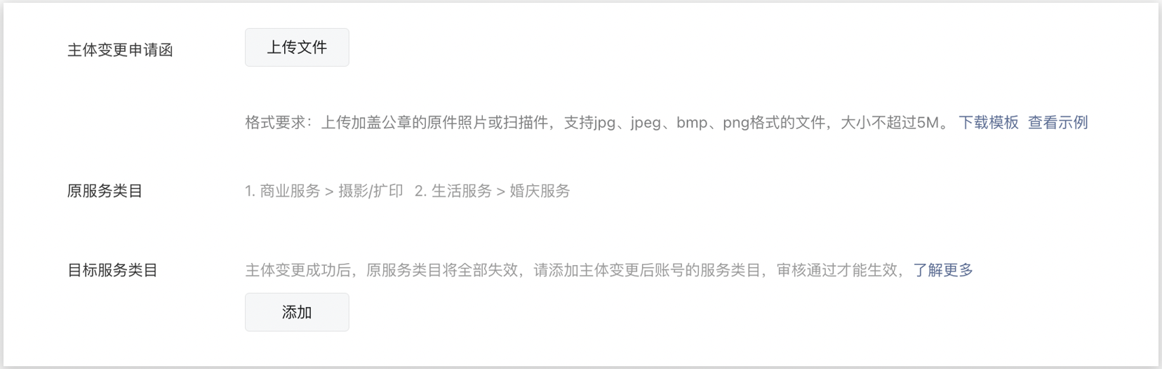 - 目标服务类目:请添加“商业服务-摄影/扩印”(如您的业务跟婚礼相关,需额外再添加“生活服务-婚庆服务”,否则将无法通过审核)。
