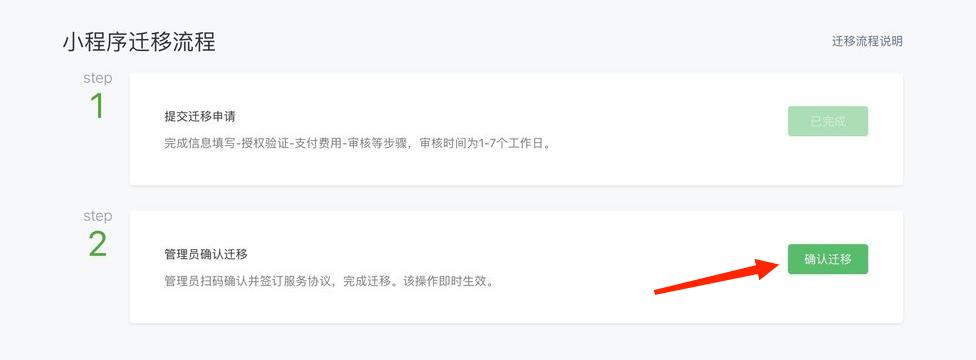 收到上述通知后,登录小程序后台,依次点击【设置】->【基本设置】->【小程序迁移】,点击“确认迁移”按钮,扫码确认并同意“服务协议”。