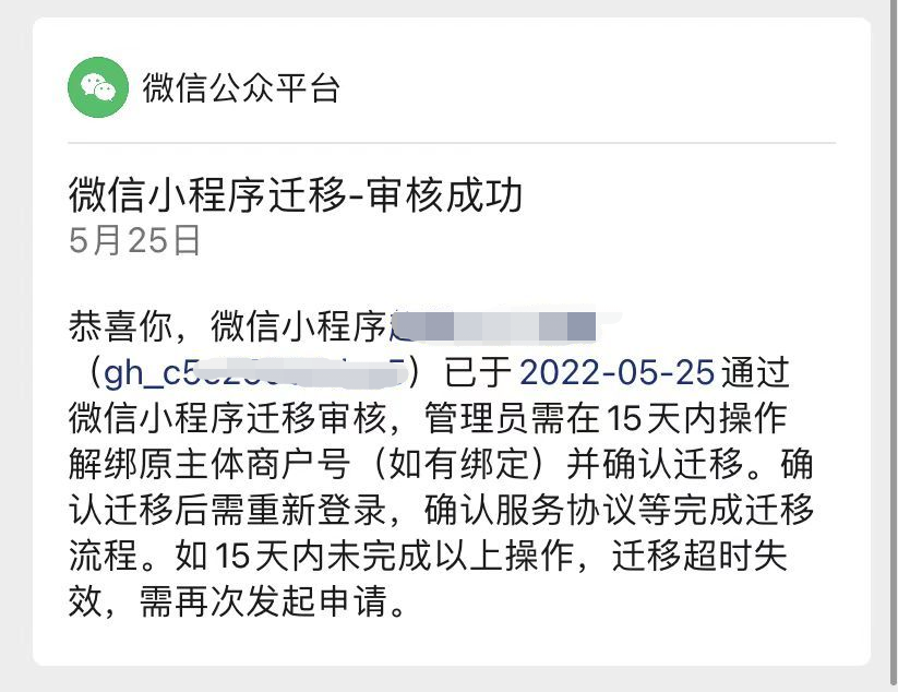 迁移时间:迁移过程会在1-7个工作日内审核完成,请留意微信通知。