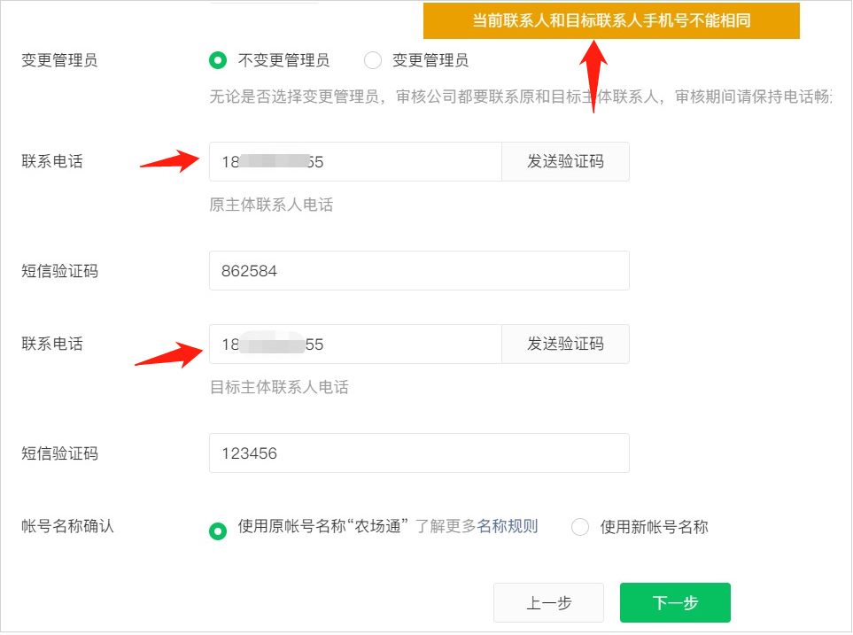 - 如选择“不变更管理员”,也需填写不同的联系电话