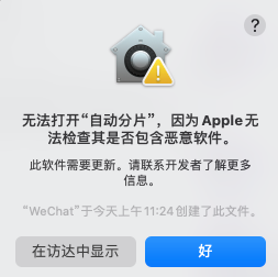 Mac自动分片工具(常见问题)情况一:无法打开“自动分片”,因为App无法检查其是否包含恶意软件。点击查看如何解决情况二:提示已损坏。点击查看如何解决 情况三:没有“任何来源”选项。点击查看如何解决情况四:应用程序“自动分片_Mac”无法打开。点击查看如何解决
