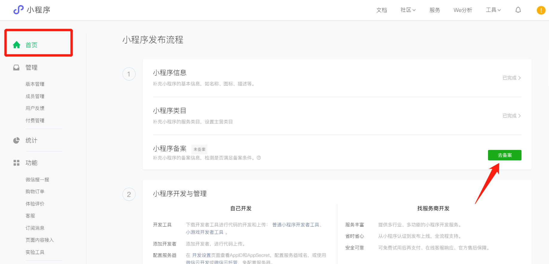 微信公众平台登录小程序后,依次点击【首页】-【去备案】即可开始备案步骤