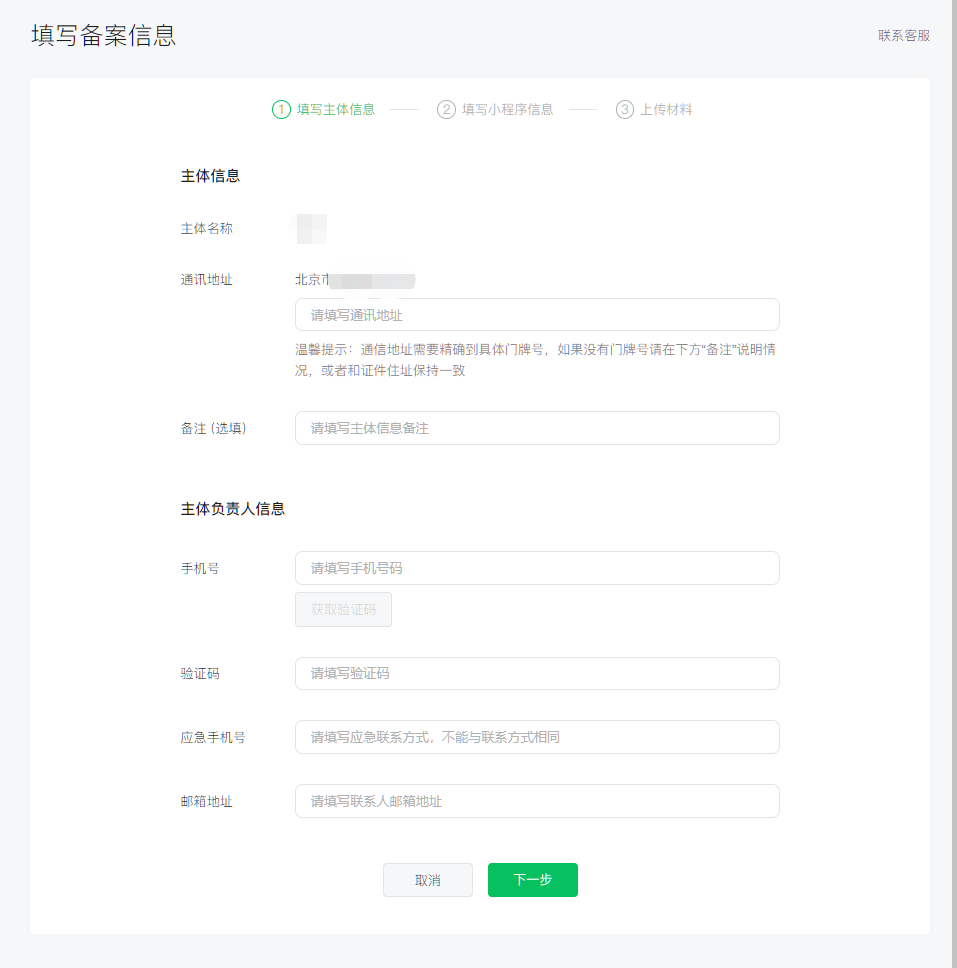 依次填写主体信息和负责人信息,点击【下一步】
