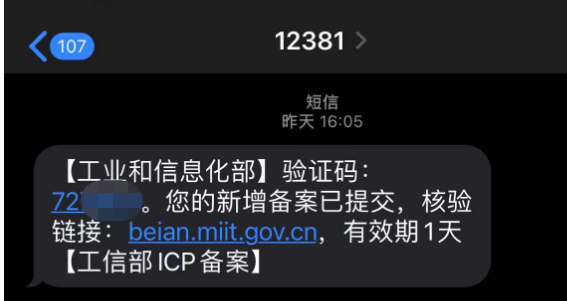 2. 备案审核期间,负责人手机会收到工信部12381的验证码短信,负责人需在1天内完成核验。