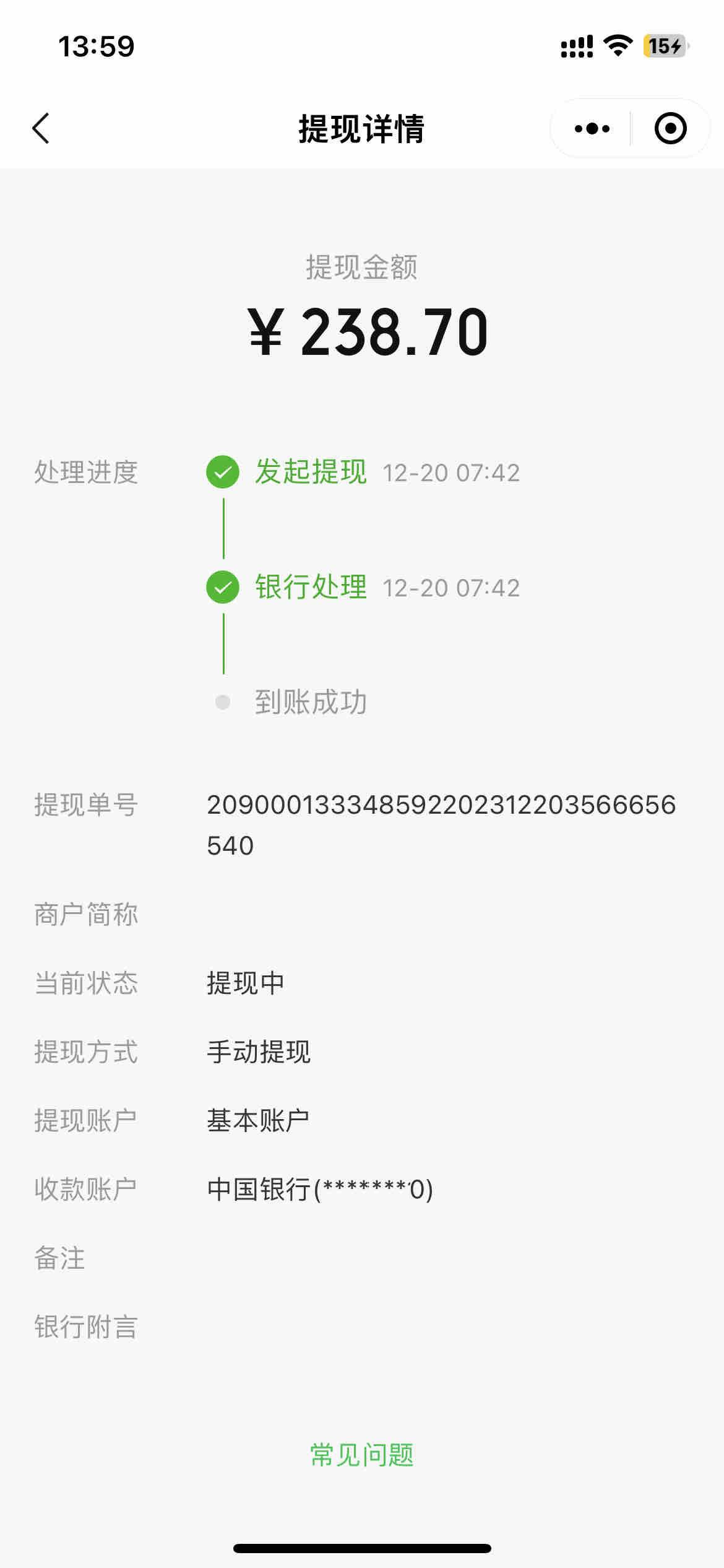 提现异常:提现金额在途微信收款及提现功能由微信管理:提现异常: 提现金额在途,约2个工作日内到账 处理建议:该资金已在途,无需处理。显示异常是由于您的微信商户开启了每日自动转账,导致一定几率下,手动和自动会重复发起提现请求引发。实际提现金额已由每日自动转账转出,约2个工作日内到账。若希望立刻查询资金现状,可打开“微信支付商家助手”小程序,点击「资金管理」-「基本账户」 ,在页面底部点击“提现记录“查看在途资金。详情查看微信官方资料3/24/2026