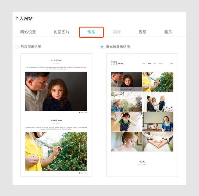 打开PC端-[个人网站]-设置[作品]-选择瀑布流展示组图