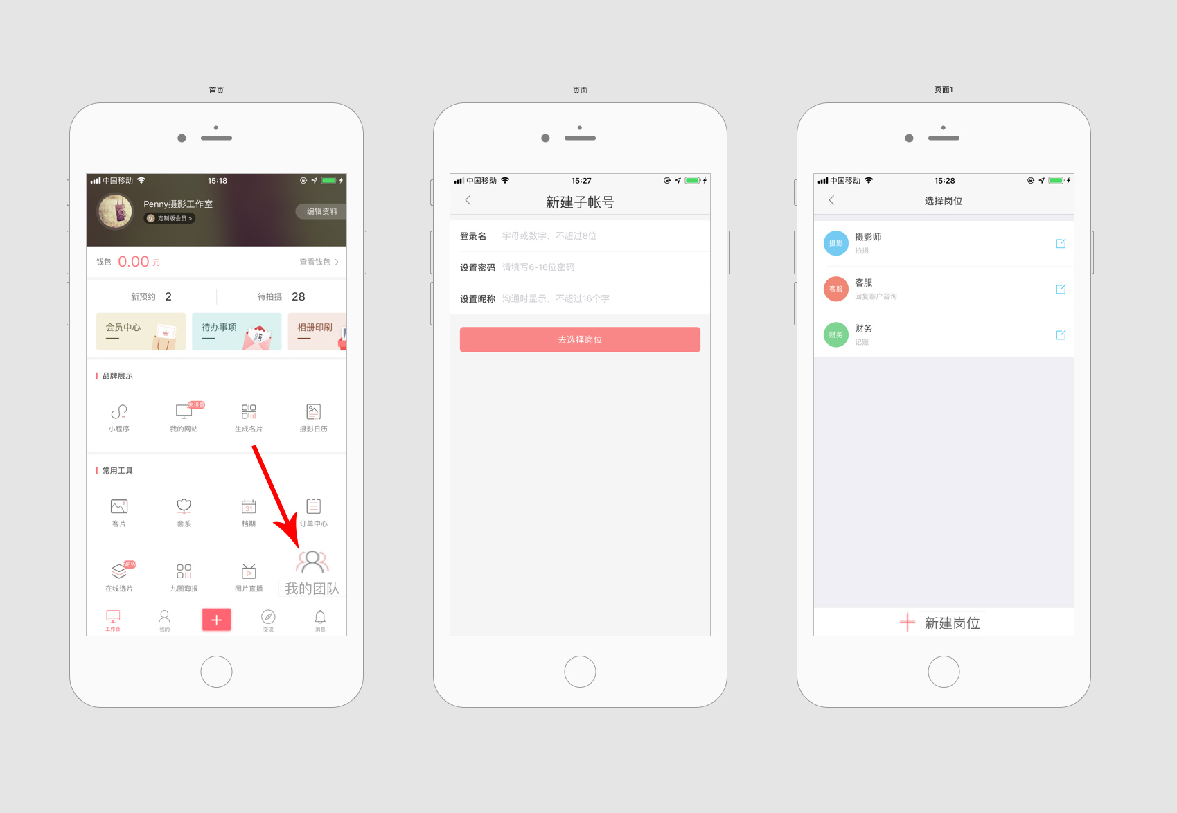 - 进入[工作台]-[团队管理],设置子账号、岗位等信息