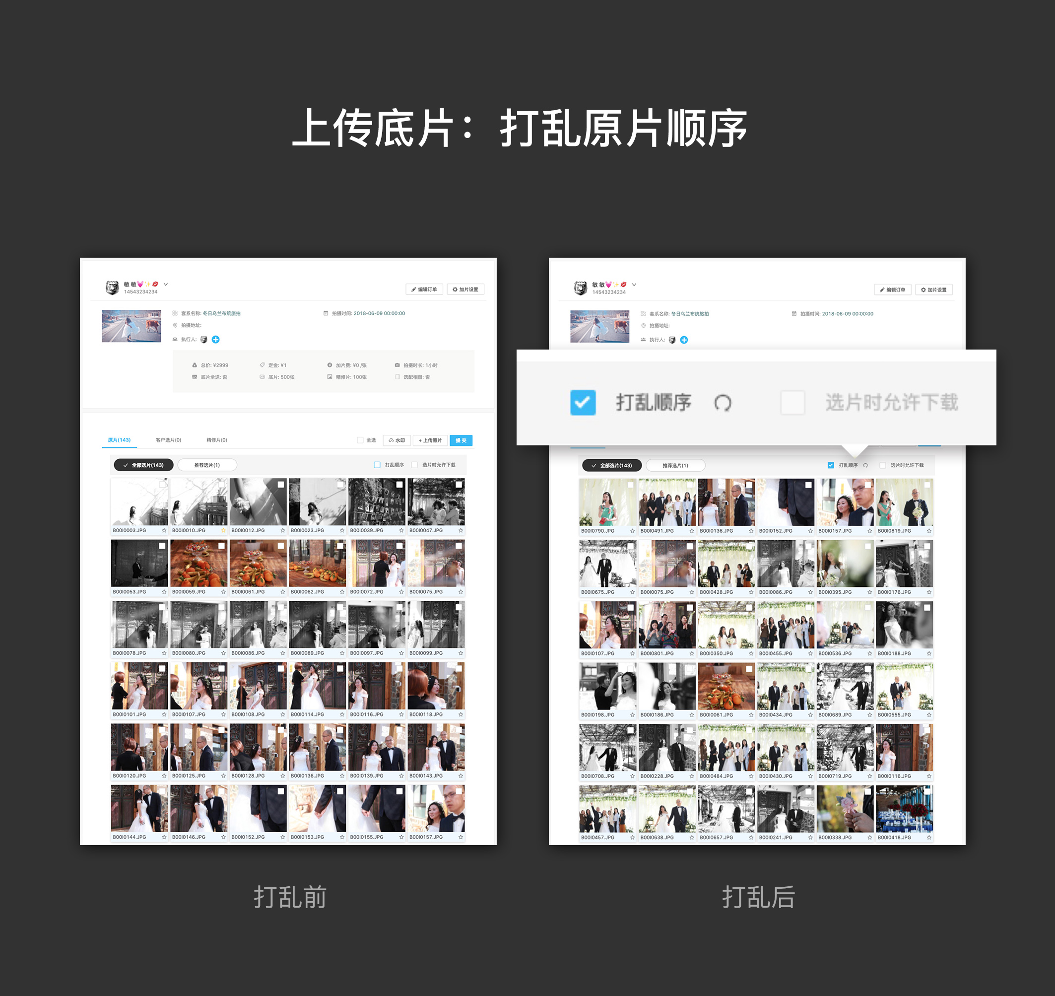 有非常多工作室表白在线选片功能,盒子也一直努力让选片更好用。新增一键打乱照片顺序,避免审美疲劳,给您的客户更好的选片体验,帮您提高加片率