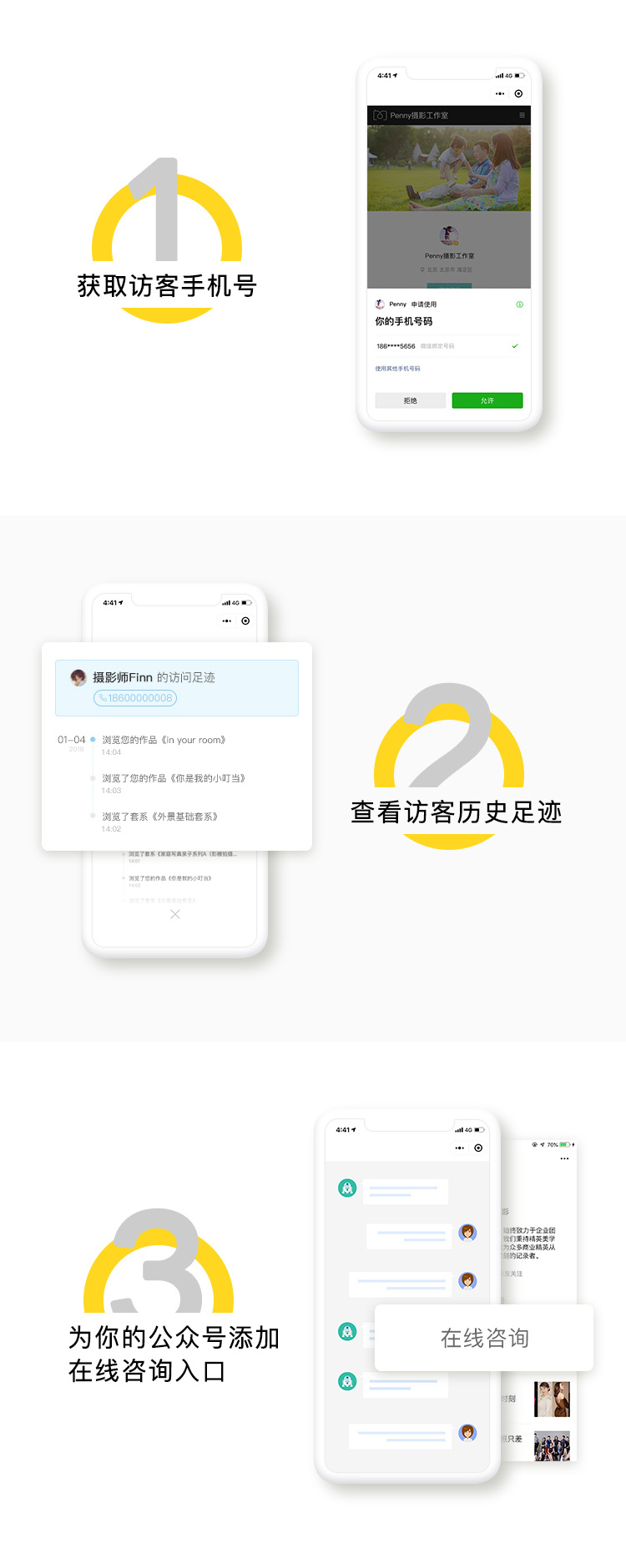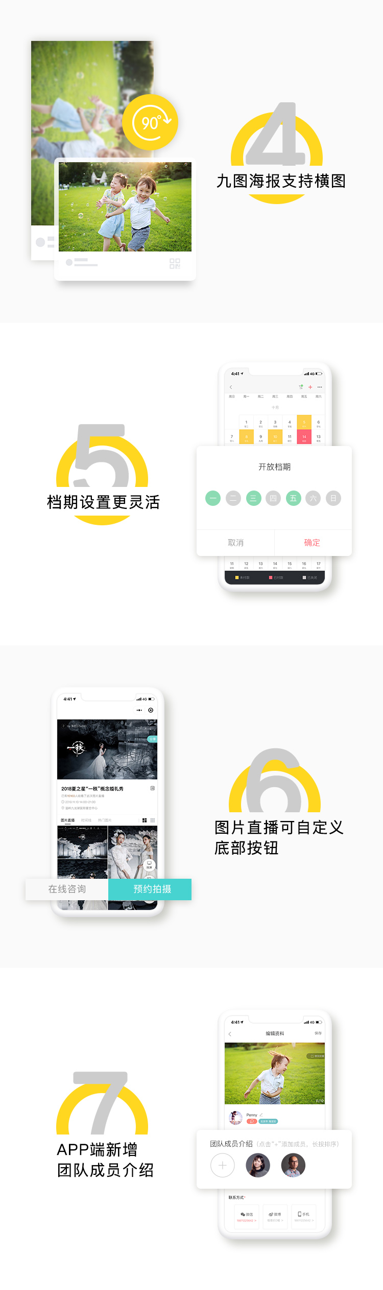 这版内测的时候,就有摄影师说:“获取访客手机号这个功能太赞了!” 其实除此之外,我们还有7大惊喜带给你们,一起来看看吧~