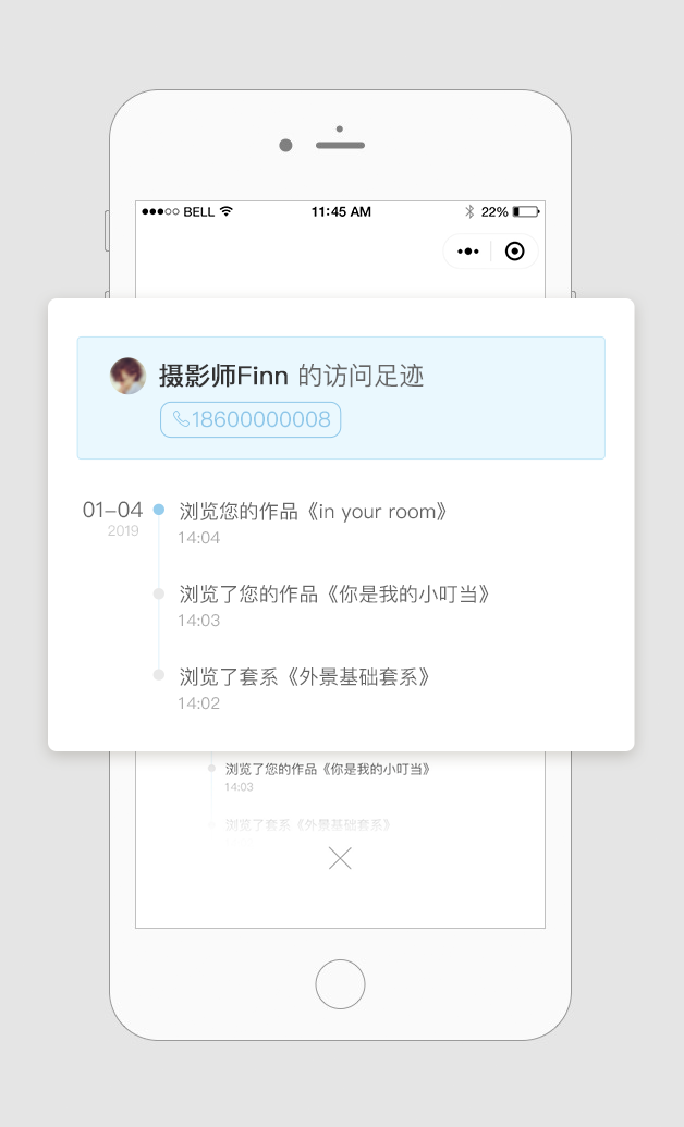 在新版APP-[消息]-[访客],摄影师可以点击查看每个访客的历史足迹,分析客户的浏览情况,调整自己的服务,并向客户发起电话回访