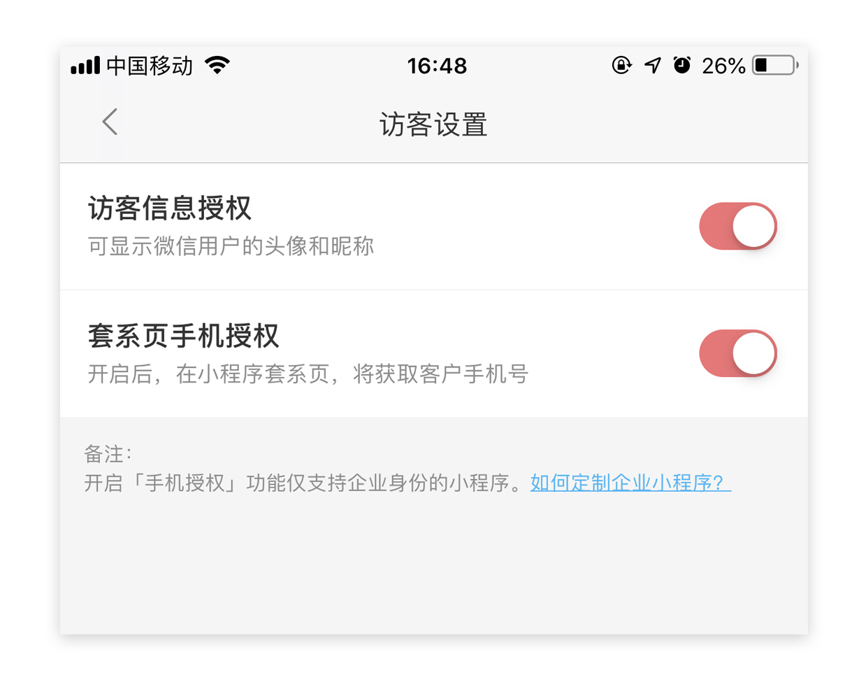 *注意:[手机授权]开关仅支持企业身份的小程序,如果您有营业执照,可以点这里查看如何定制企业版小程序