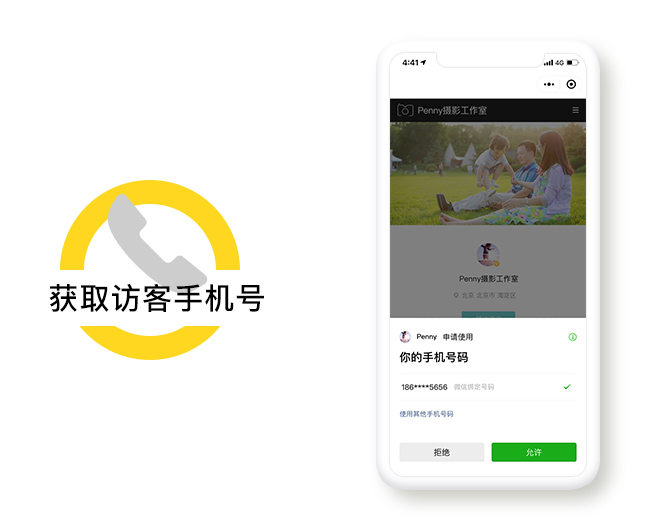 你只需开启[手机授权]开关,就可以在客户访问你的小程序套系时,获取访客的手机号码,方便客服联系,促进成单!