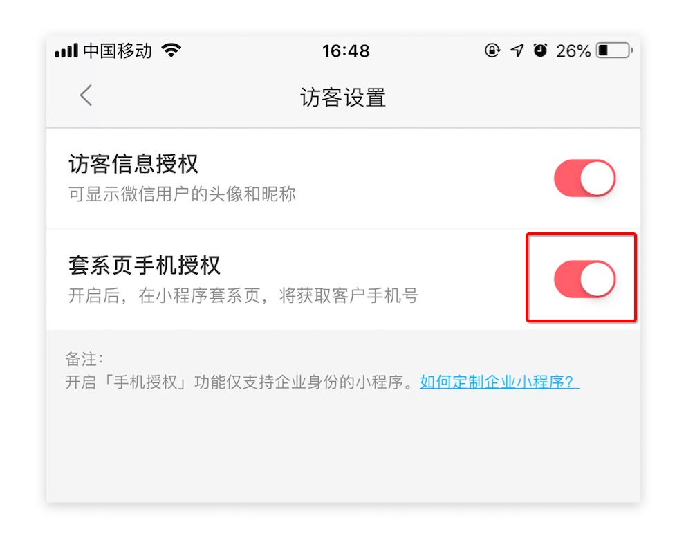*注意:[手机授权]开关仅支持企业身份的小程序,如果您有营业执照,可以点这里查看如何定制企业版小程序