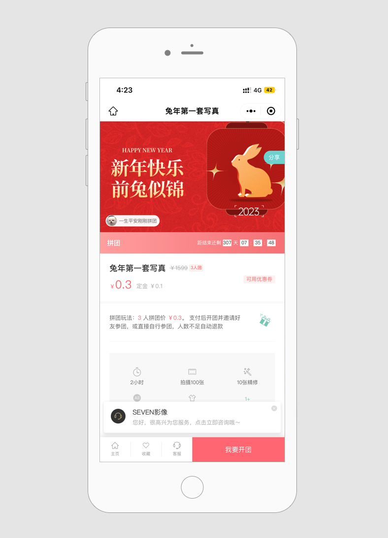 创建拼团活动,利用客户自发的分享传播效应,为工作室带来更多的单量~