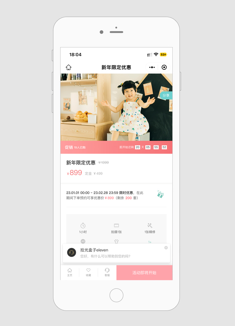 “新年【儿童】限定优惠,原价1399,现价仅899,数量有限,赶紧预定为宝宝新的一年留下新的回忆吧~