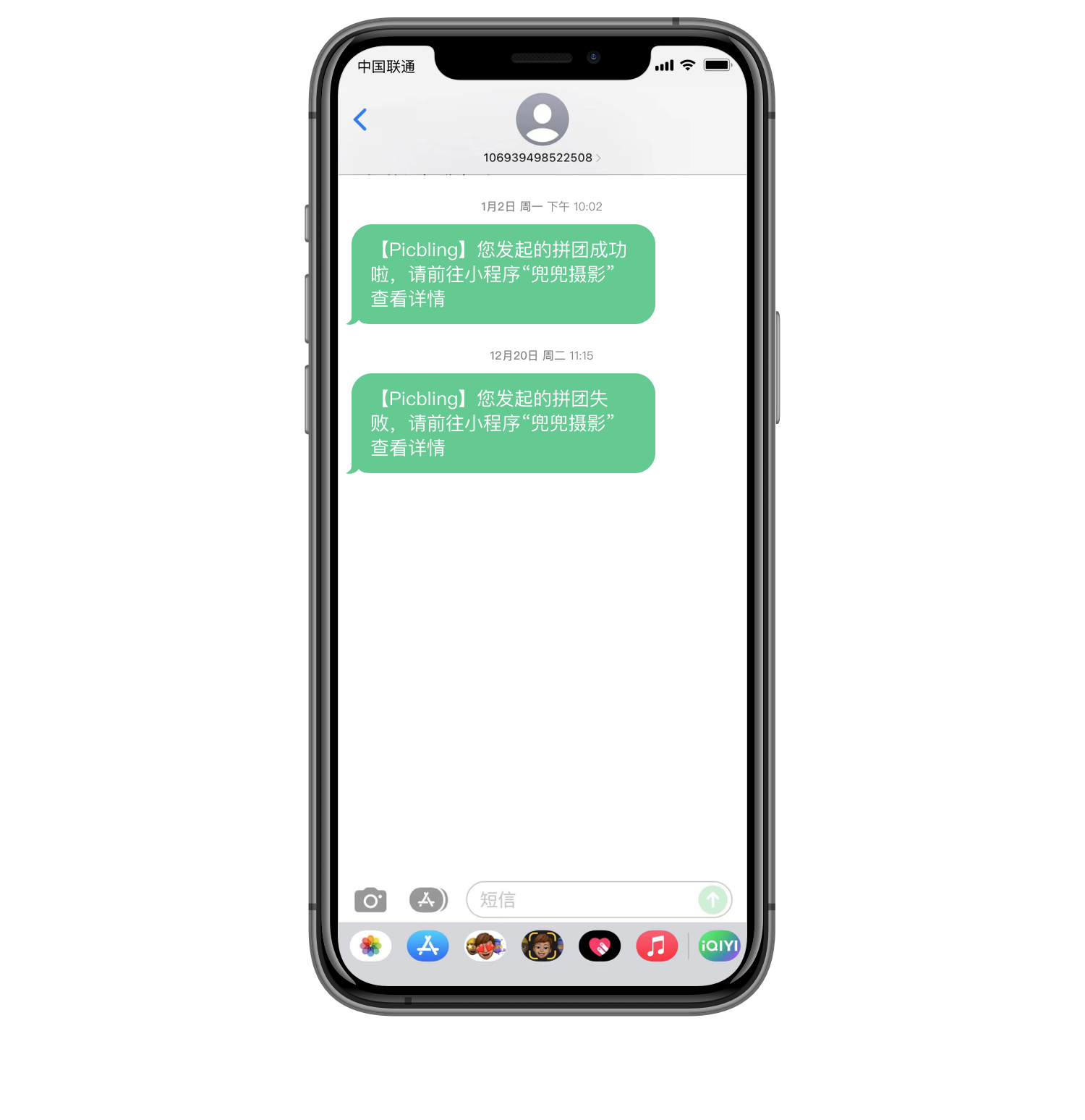 顾客:拼团成功或失败,系统都会给顾客发送短信,提醒他们注意之后的订单状况;