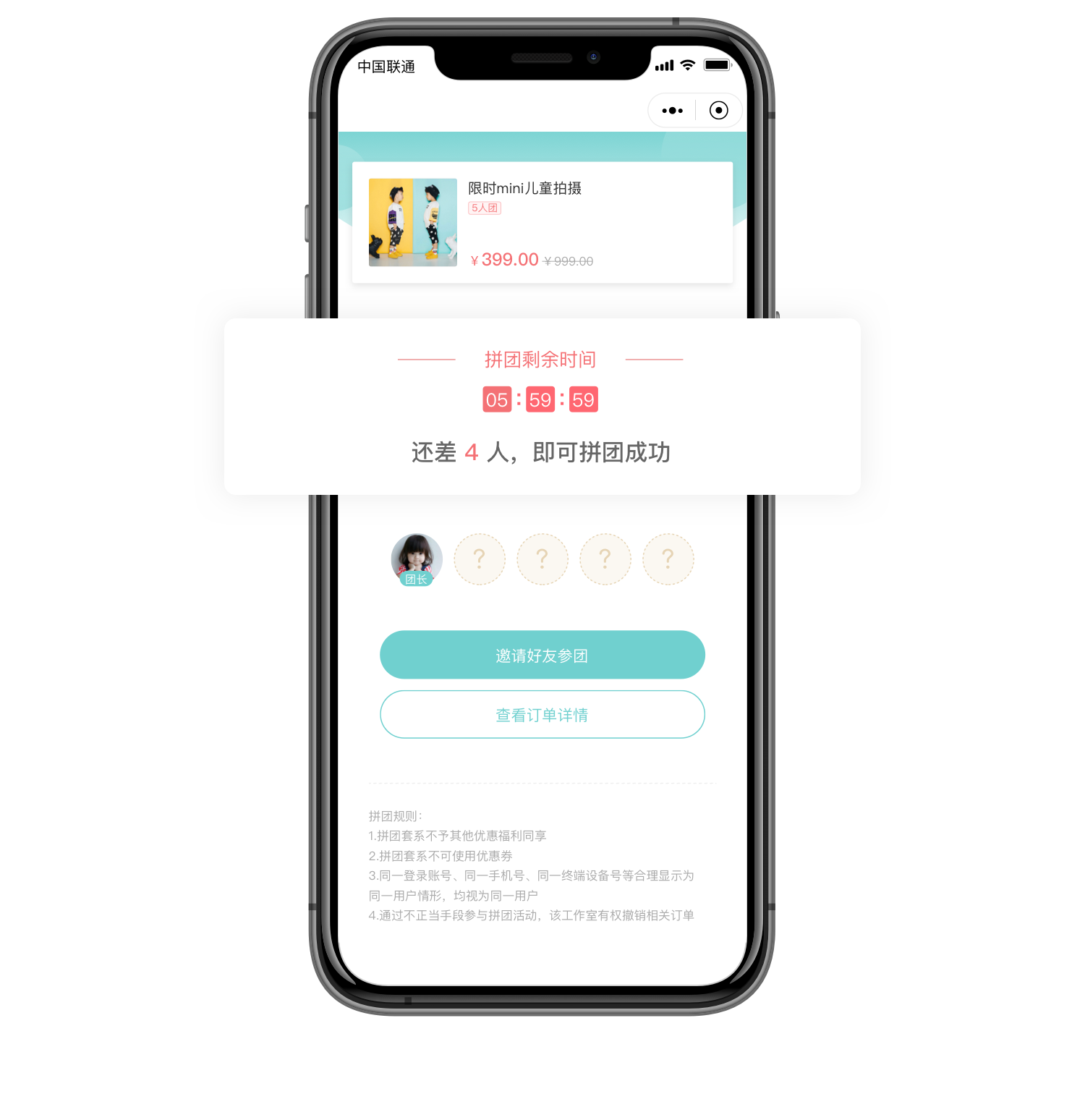 2、成团时限:是指客户邀请好友参团的时限。比如,顾客A发起拼团后,48小时内必须与好友成团,两天时间未成团,则拼团失败。